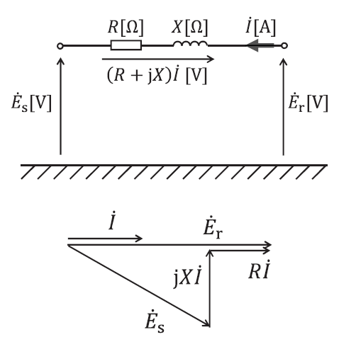 (1) 需要家から配電線へ逆潮流 (力率1) がある場合の、需要家端の相電圧 (1線と中性点間の電圧) \(\dot{E_r}\) と変電所の相電圧 \(\dot{E_s}\) の関係を示すベクトル図及び関係式を \(\dot{E_s}\), \(\dot{E_r}\), \(\dot{I}\), \(R\), \(X\) を用いて描け。ただし、ベクトル図は \(\dot{E_r}\) (位相0) を基準とし、電流 \(\dot{I}\) は図中の矢印の向きを正とする。